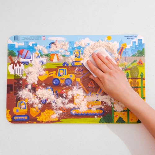 - Construction plate, utensils, and placemat are designed to work together to combine eating and play