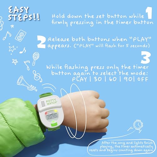 Potty Watch makes potty training fun & easy! The patented potty training timer helps parents solve one of the biggest problems of toilet training – reminding their toddler to try to go to the bathroom. With the Potty Watch strapped to their wrist, toddlers will be reminded by fun music and blinking lights to head to the bathroom. Parents choose the time between bathroom visits, extending it as children get better at figuring out when to go potty.
